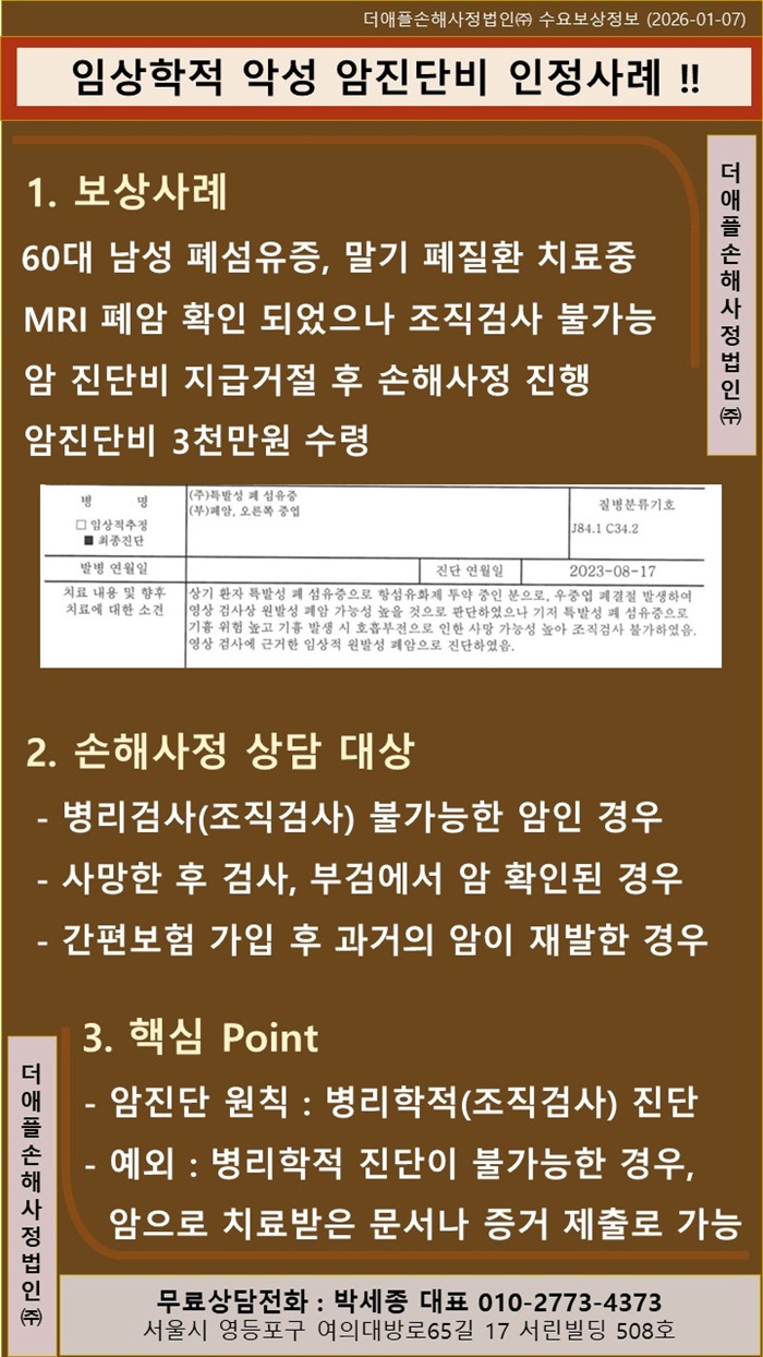 ♡ 임상학적 악성 암진단비 인정사례 !!  60대 남성 폐섬유증, 말기 폐질환 치료중 MRI 폐암 확인 되었으나 조직검사 불가능 암 진단비 지급거절 후 손해사정 진행  암진단비 3...