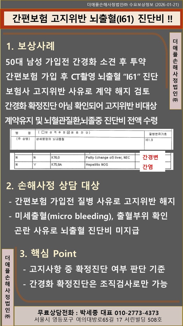 ♡ 간편보험 고지위반 뇌출혈(I61) 진단비 !!  50대 남성 가입전 간경화 소견 후 투약 간편보험 가입 후 CT촬영 뇌출혈 “I61” 진단 보험사 고지위반 사유로 계약 해지 검토 간경화 확...