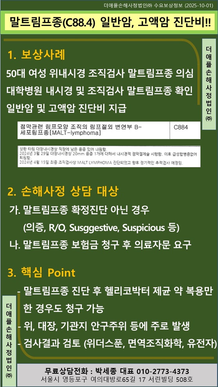 ♡ 말트림프종(C88.4) 일반암, 고액암 진단비!! 50대 여성 위내시경 조직검사결과 말트림프종 의심 대학병원 전원 추가 내시경 및 조직검사 말트림프종 확인 일반암 및 고액암 진단비 ...