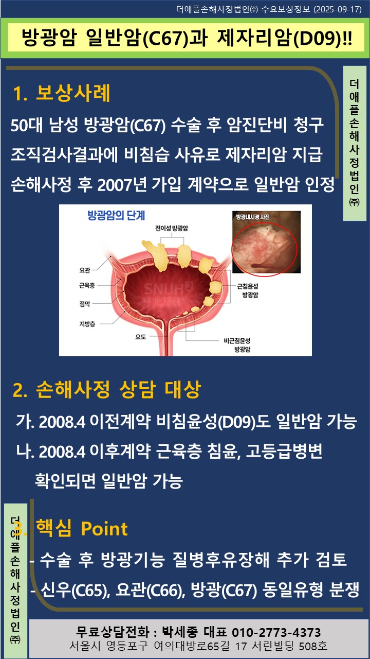 ♡ 방광암 일반암(C67)과 제자리암(D09)!! 50대 남성 방광암(C67) 수술 후 암진단비 청구 조직검사결과에 비침습 사유로 제자리암 지급 손해사정 후 2007년 가입 계약으로 일반암 인...