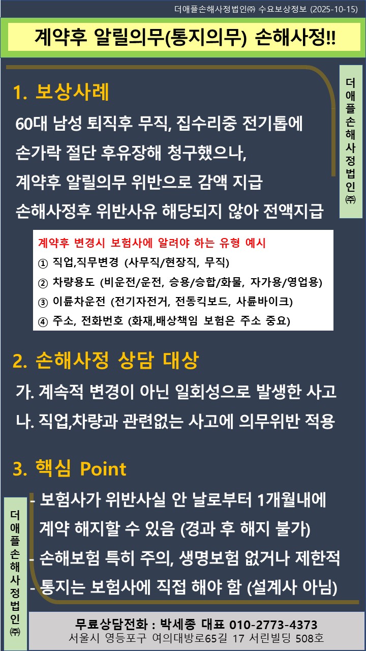 ♡ 계약후 알릴의무(통지의무) 손해사정 !! 60대 남성 퇴직후 무직, 집수리중 전기톱에 손가락 절단 후유장해 청구했으나, 통지의무(계약후 알릴의무)위반으로 감액 지급 &nbs...