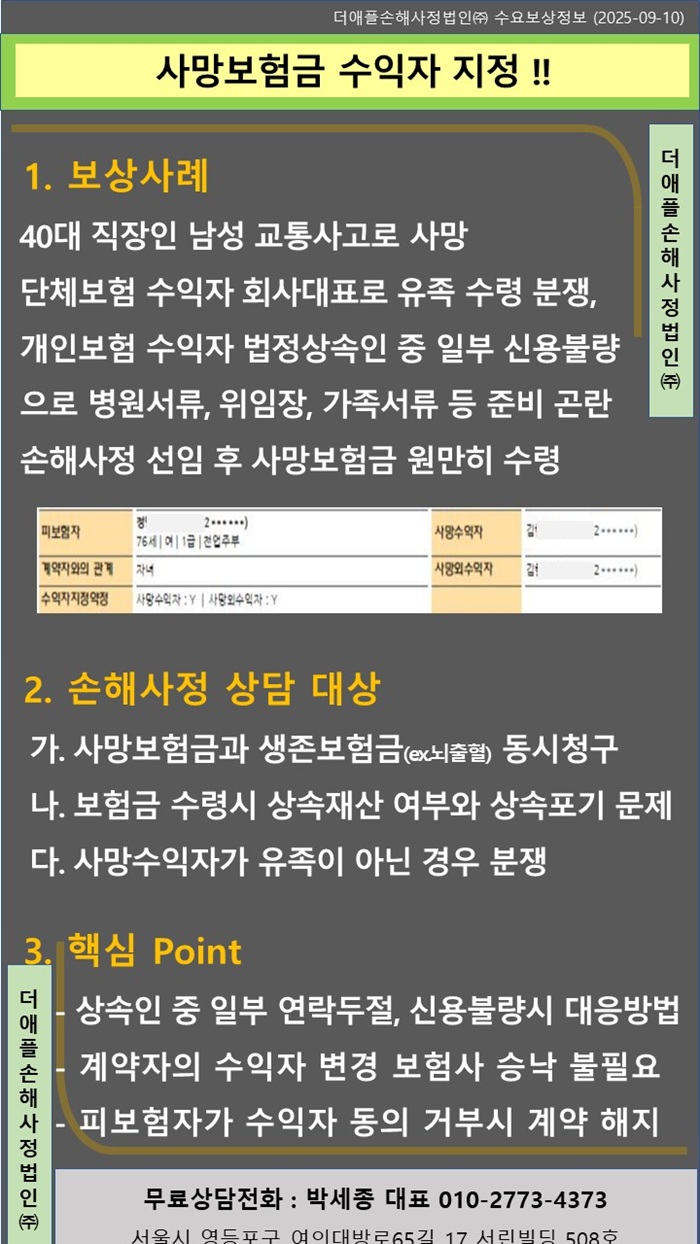 ♡ 더애플손해사정 수요보상정보 ♡ 사망보험금 수익자 지정 !! 40대 직장인 남성 교통사고로 사망 단체보험 수익자 회사대표로 유족 수령 분쟁, 개인보험 수익자 법정상속인 중 일부 신...