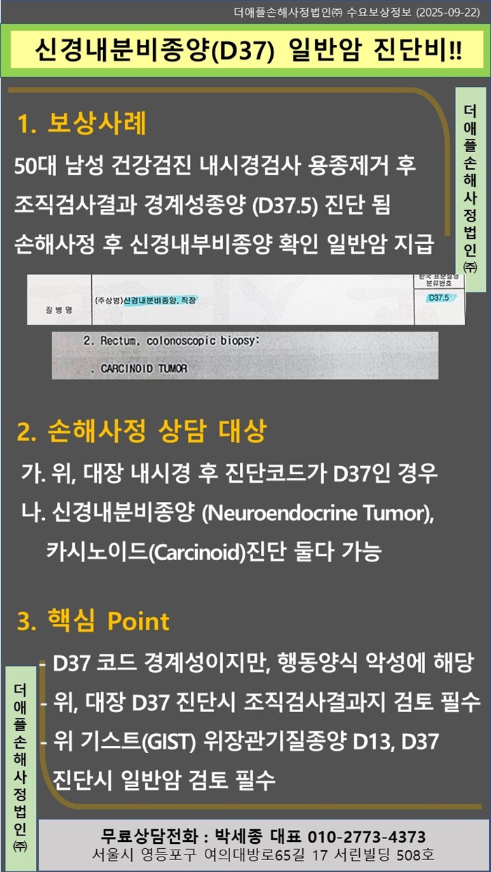 ♡ 신경내분비종양(D37) 일반암 진단비!! 50대 남성 건강검진 내시경검사 용종제거 후 조직검사결과 경계성종양 (D37.5) 진단 됨 손해사정 후 신경내부비종양 확인 일반암 지급 &nb...