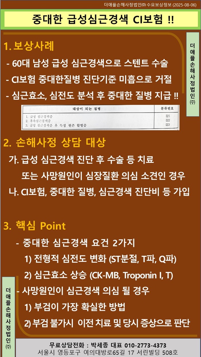 ♡ 중대한 급성심근경색 CI보험 !! - 60대 남성 급성 심근경색으로 스텐트 수술 - CI보험 중대한질병 진단기준 미흡으로 거절 - 심근효소, 심전도 분석 후 중대한 질병 지급 !!&nbs...