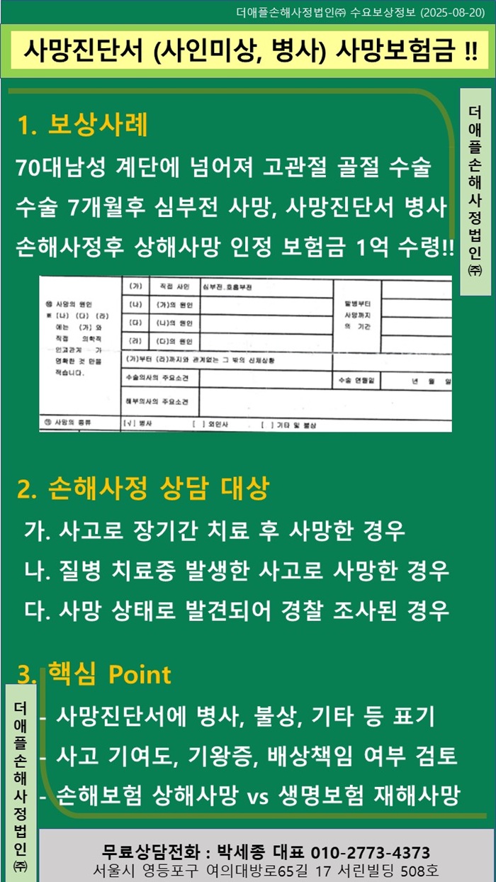 ♡ 사망진단서 (사인미상, 병사) 사망보험금 !! 70대남성 계단에 넘어져 고관절 골절 수술 수술 7개월후 심부전 사망, 사망진단서 병사 손해사정후 상해사망 인정 보험금 1억 수령!!&...