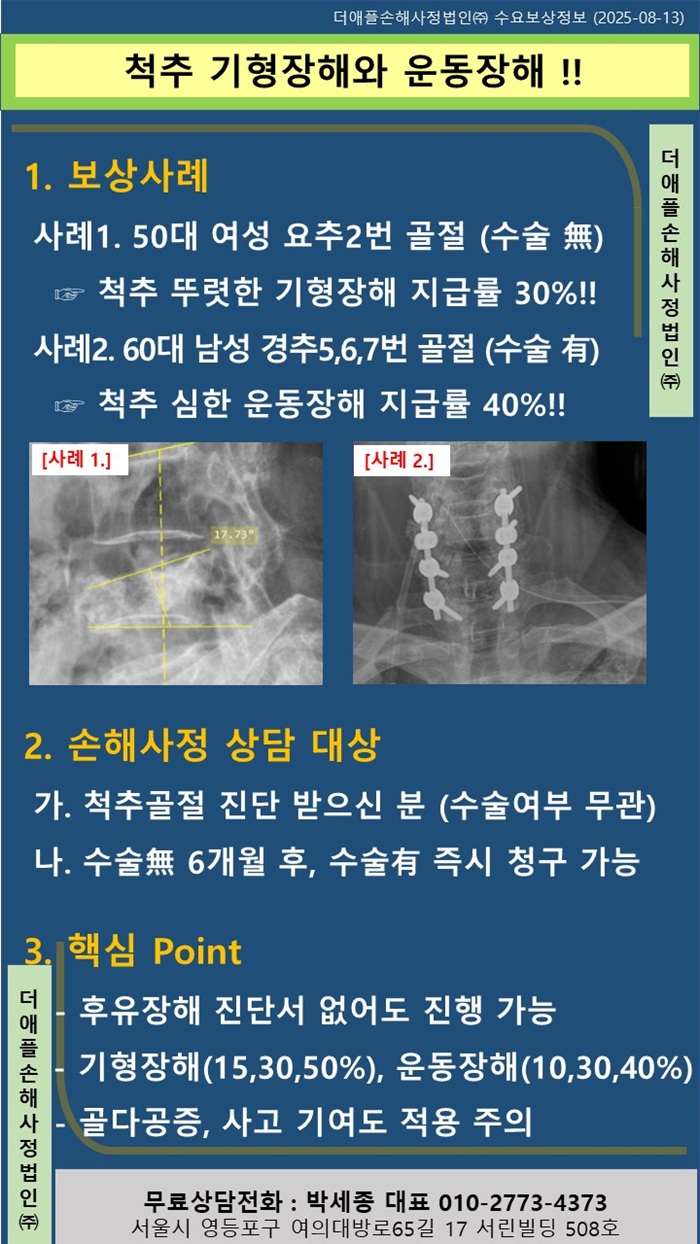 ♡ 척추 기형장해와 운동장해 !! 사례 1. 50대 여성 요추 2번 골절 (수술 無) ☞ 척추 뚜렷한 기형장해 지급률 30%!! 사례 2. 60대 남성 경추5,6,7번 골절 (수술 有)&nb...