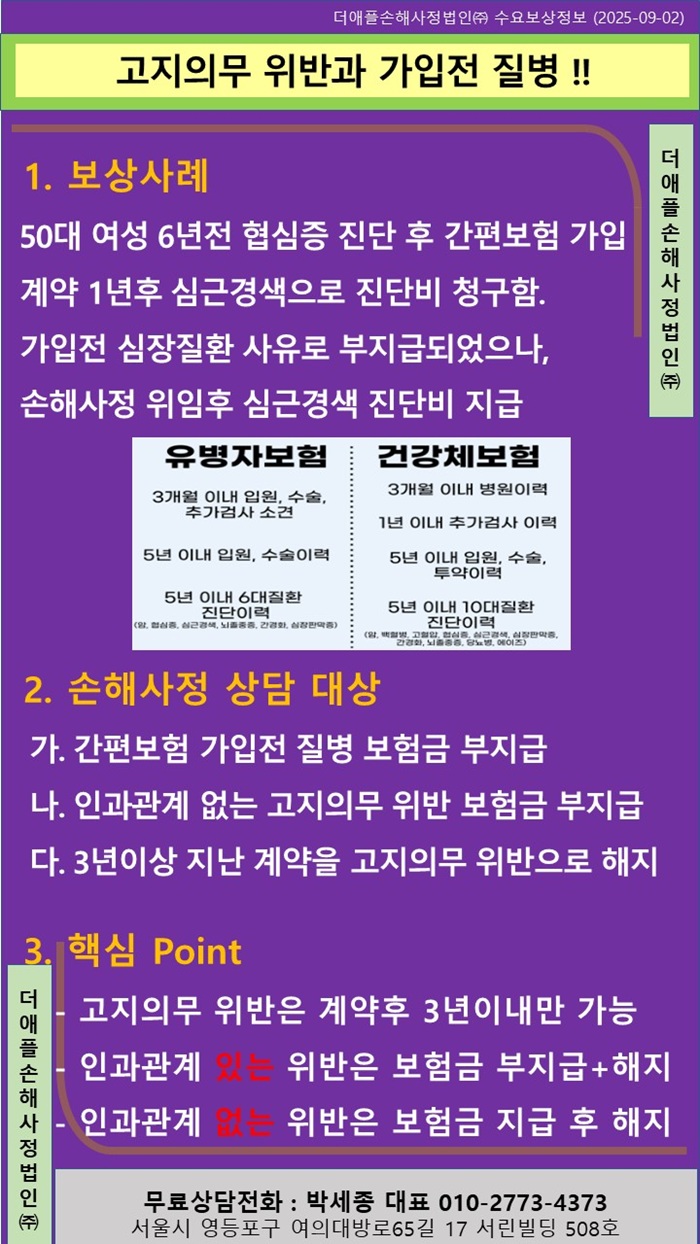 ♡ 더애플손해사정 수요보상정보 ♡ 고지의무위반과 가입전 질병 !! 50대 여성 6년전 협심증 진단 후 간편보험 가입 계약 1년후 심근경색으로 진단비 청구함. 가입전 심장질환 사...