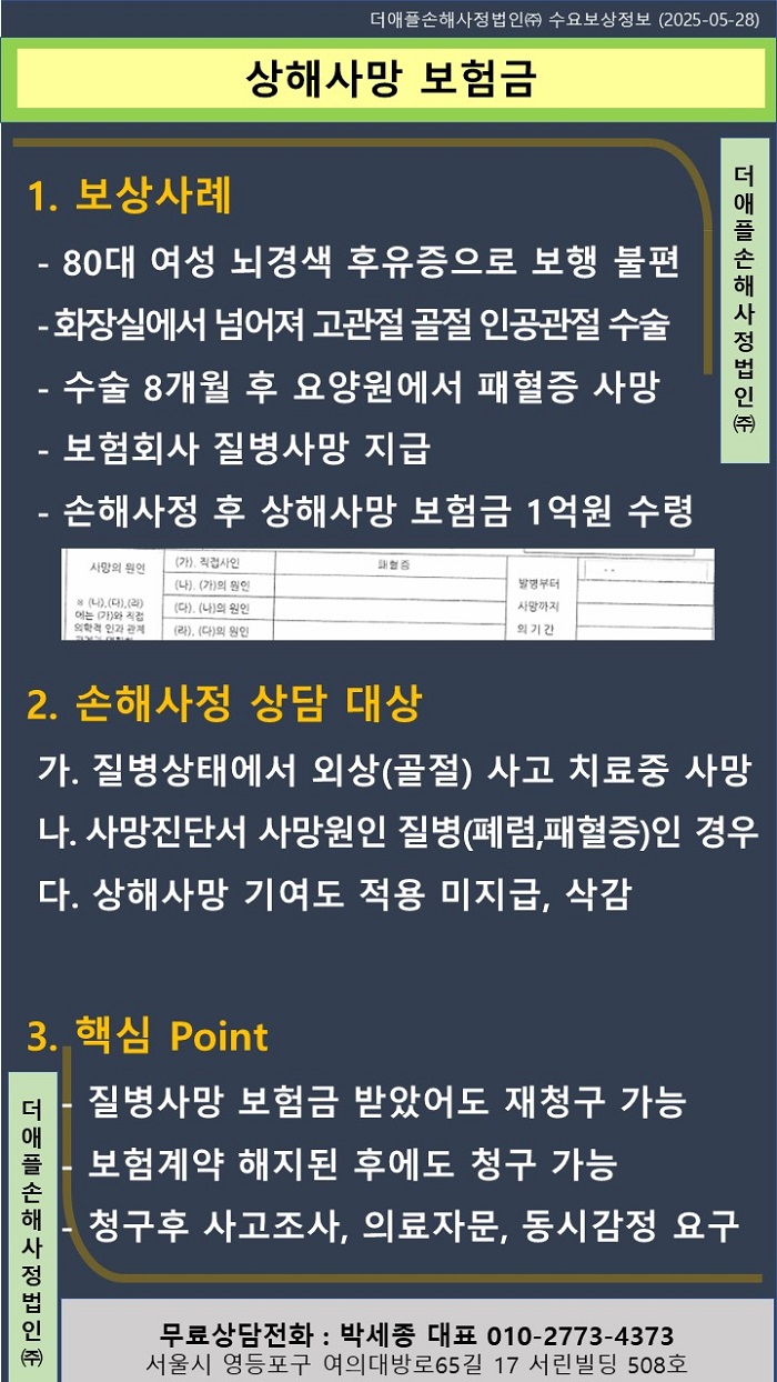 ♡ 상해사망 보험금 !! - 80대 여성 뇌경색 후유증으로 보행 불편하던 중 - 화장실에서 넘어져 고관절 골절 인공관절 수술 - 수술 8개월 후 요양원에서 패혈증 사망 - 보험회사 질병사...