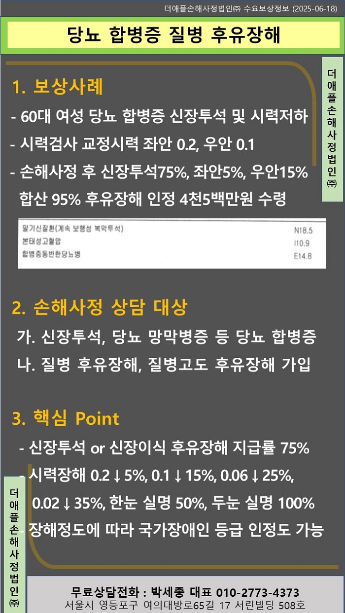 ♡ 당뇨 합병증 질병 후유장해 !! - 60대 여성 당뇨 합병증으로 신장투석 및 시력저하 - 교정시력 검사 좌안 0.2, 우안 0.1 - 손해사정 후 신장투석75%, 좌안5%, 우안15% 합산 95%&n...