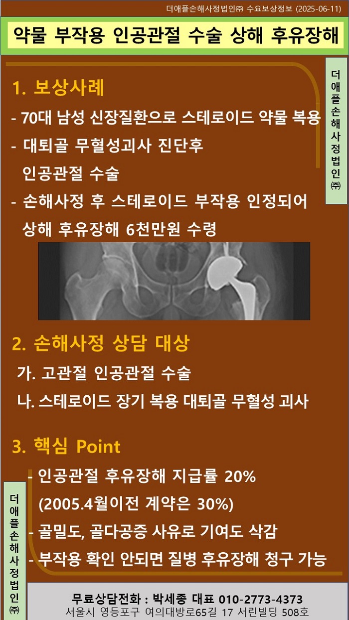 ♡ 스테로이드 약물 부작용 고관절 인공관절 수술 상해 후유장해 !! - 70대 남성 신장질환으로 장기간 스테로이드 약물 복용 - 골반 통증으로 검사결과 대퇴골 무혈성괴사 진단후 인공관절 수술 -...