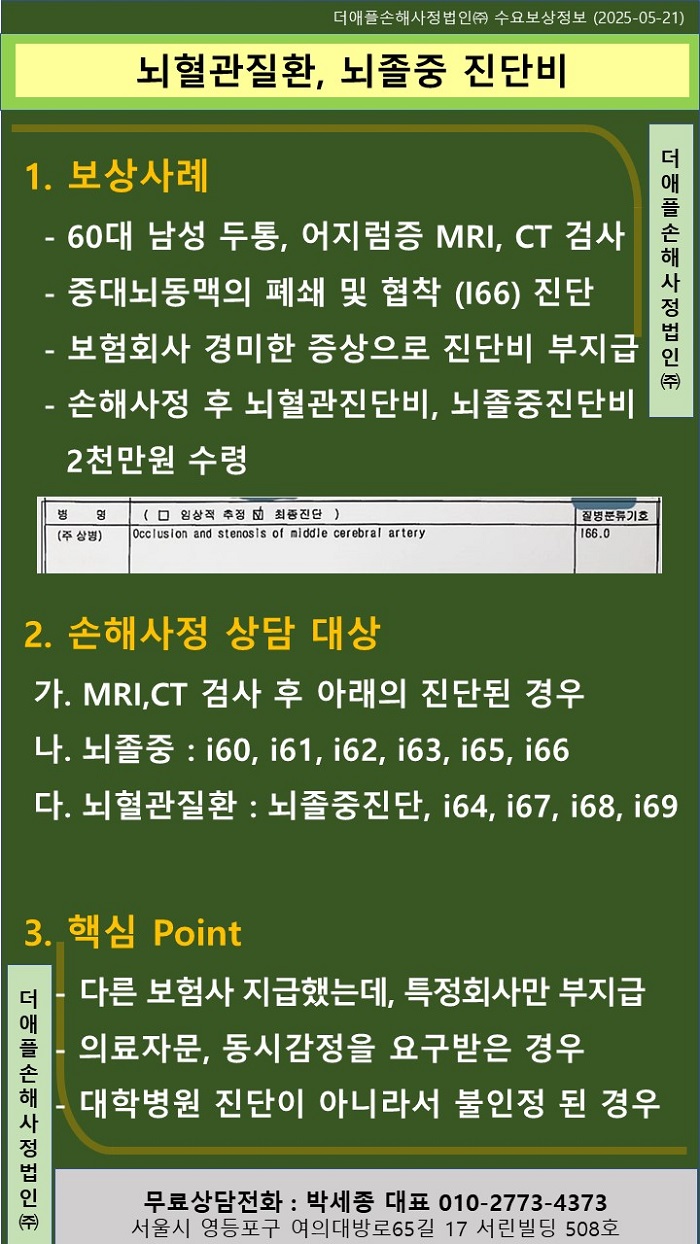 ♡ 더애플손해사정 수요보상정보 ♡ 뇌혈관질환, 뇌졸중 진단비 !! - 60대 남성 두통, 어지럼증으로 MRI, CT 검사 - 중대뇌동맥의 폐쇄 및 협착 (I66...