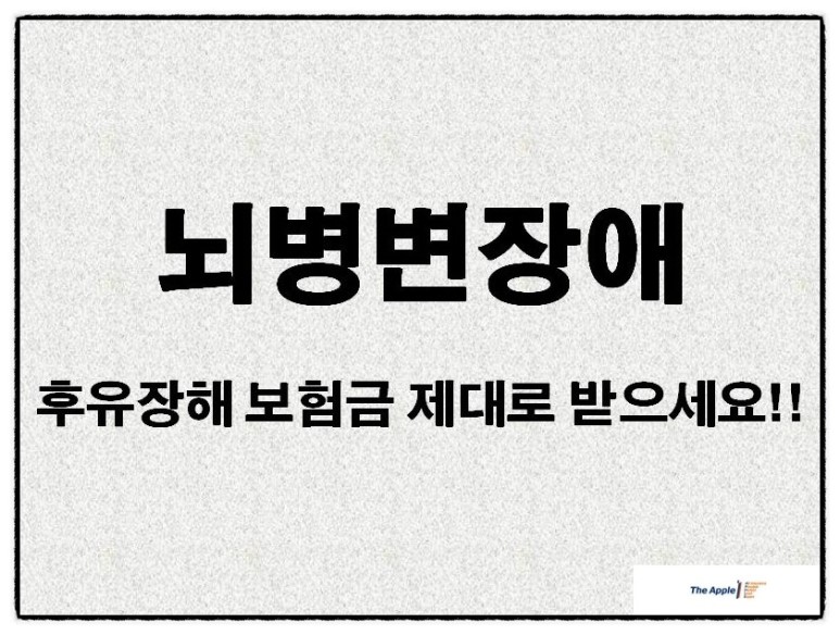 뇌병변장애 후유장해 보험금 보상 제대로 받기!! 안녕하세요~ 더애플손해사정입니다 이번시간에는 뇌병변장애 후유장해 보험금 보상을 제대로 받는 법에 대해 알아보겠습니다 뇌병변...